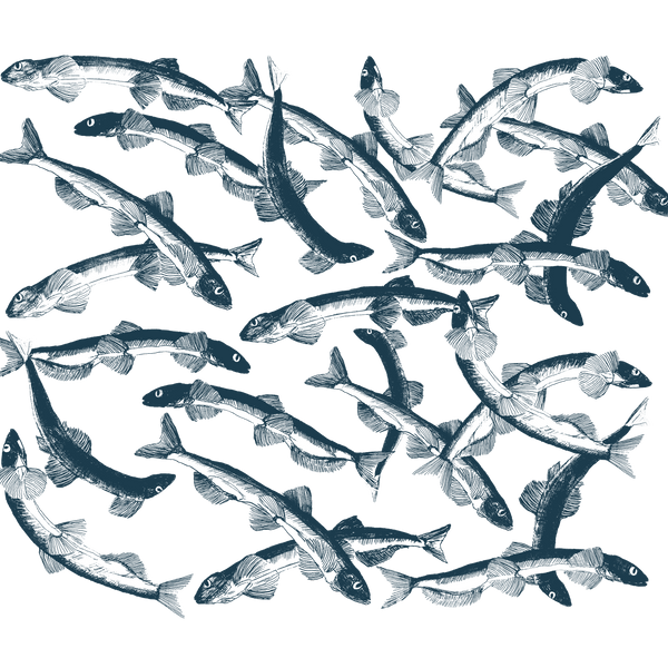 L'idée de concevoir ce motif s'est présentée à moi de manière fortuite! À ma grande surprise, lors d’un voyage en voilier à la Baie St-Pancrace sur la Côte-Nord, nous attendaient sur place des centaines de capelans nageant à proximité de nous! Moi qui adore dessiner des poissons vivants dans leur habitat naturel en plus! Quelques instants plus tard, tout plein d’illustrations de poissons garnissaient mon cahier à croquis. Ce motif est donc le résultat d'une aventure inopinée que je souhaite vous partager! Encore une fois, je n'ai pas été déçue de ma visite à ce magnifique endroit que j’adore!